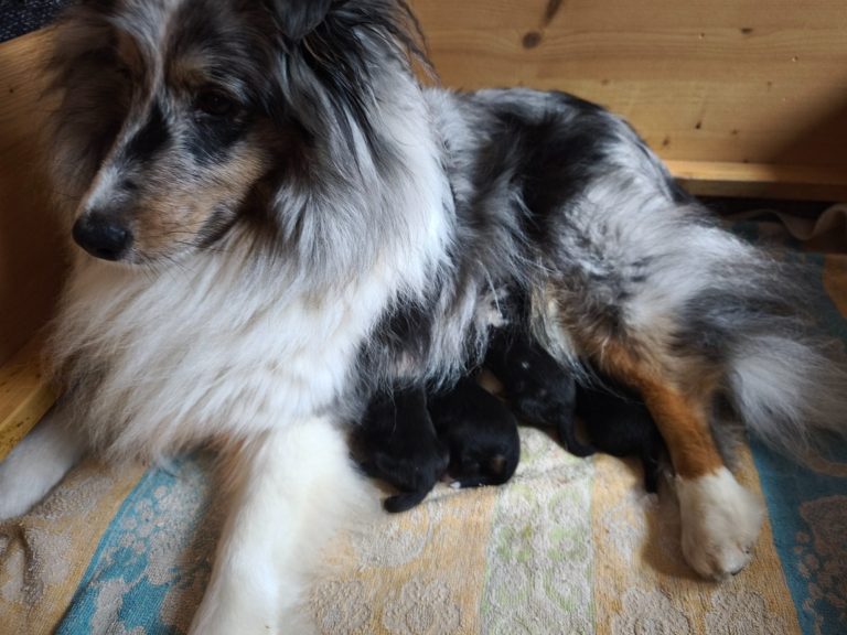 Als Boomer knapp 5 Jahre alt war, waren wir auf der Suche nach einem Spielkameraden für ihn und wurden bei den Züchtern nicht fündig. Deshalb zog dann Anfang 2010 unsere Sheltie-Yorki-Mischlingsdame Xenia bei uns ein. Da kam dann auch der Wunsch nach der eigenen Zucht bei mir auf und ich informierte mich über alles, was da wichtig ist und was alles theoretisch auf mich zukommen würde. Im Frühjahr 2012 war es dann soweit und unsere erste Zuchthündin Amy ("April in blue from Castle Street") zog bei uns ein. Den ersten Wurf mit ihr hatten wir im März 2014.